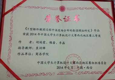 2014年 5月24日,2014年(第7届)中国老员工计算机设计大赛西北赛区决赛在西北大学太白校区隆重举办。由公司教师袁训锋博士指导,英国365集团公司物理学1201胡瑞霞,电信1206魏蕾,电气1203李磊创作的作品《T型铸件凝固过程中的温度场数值模拟研究》在决赛中荣获西北赛区三等奖。