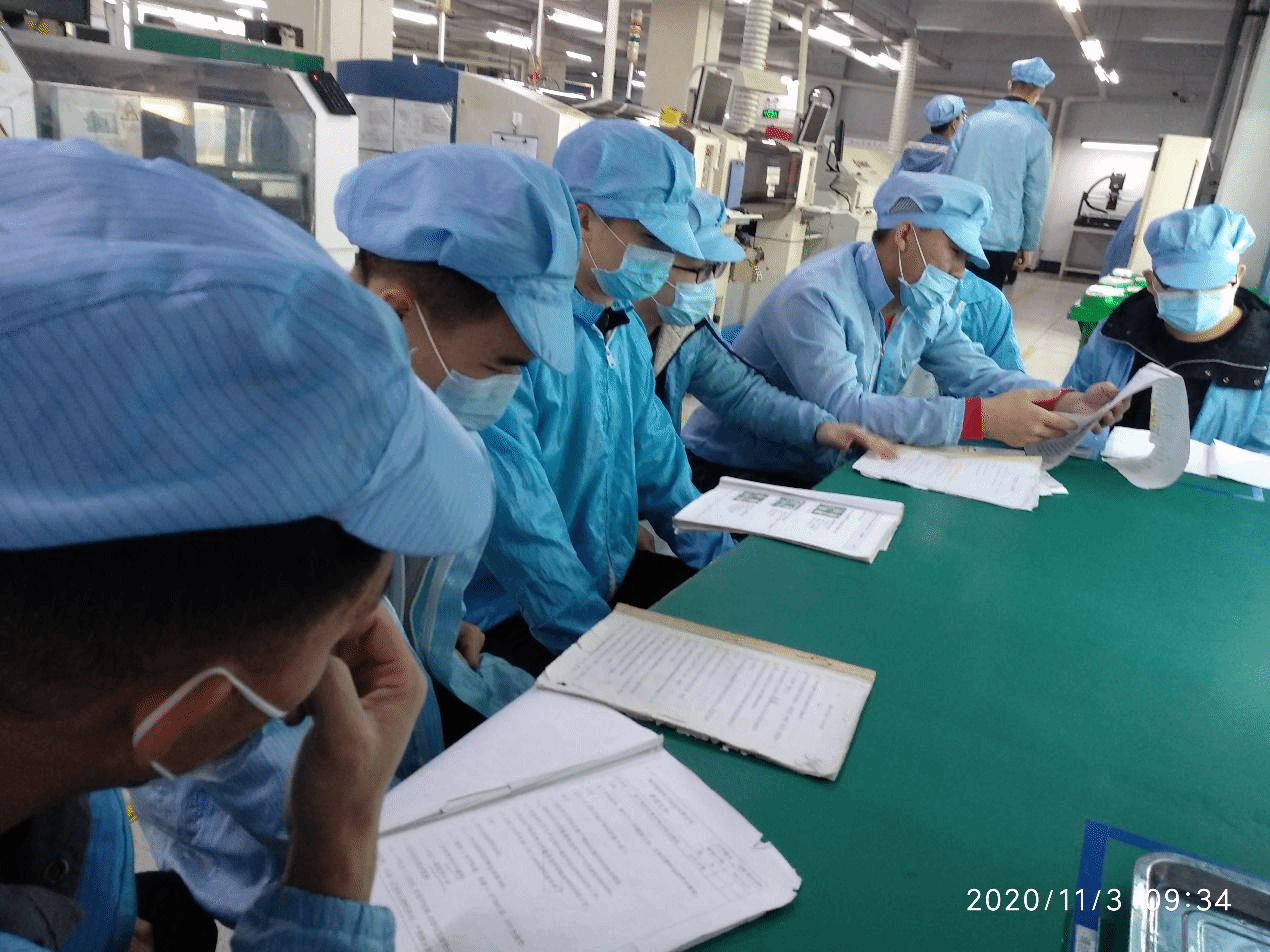 从11月3日上午8时开始,员工们开始了正式入厂实习。每天早上,员工们首先进行测体温等防疫工作,然后身着统一的工作服、工作帽和防静电鞋,按顺序进入车间,按照师傅的安排进入生产线,并在师傅的指导下认真进行当天的工作任务。