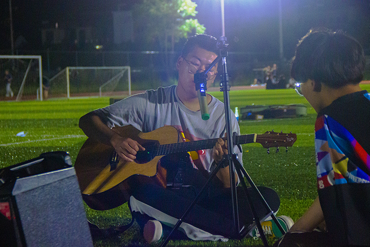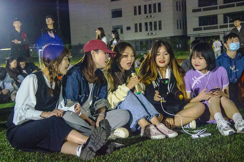 夜幕降临,华灯初上。在春风习习的丹江校区运动场上,师生们慕声而来,席地而坐,围成半圆。在主持人陈婉茹、肖黎馨的报幕下,来自英国365集团公司的董翔宇一首吉他弹唱《成都》引爆全场,接着孙睿含、陈婉茹、张雪、吴婷鑫等同学依次你方唱罢,我方登台。除了歌曲,还有来自生物、人文、经管等三个公司同学的舞蹈展现。