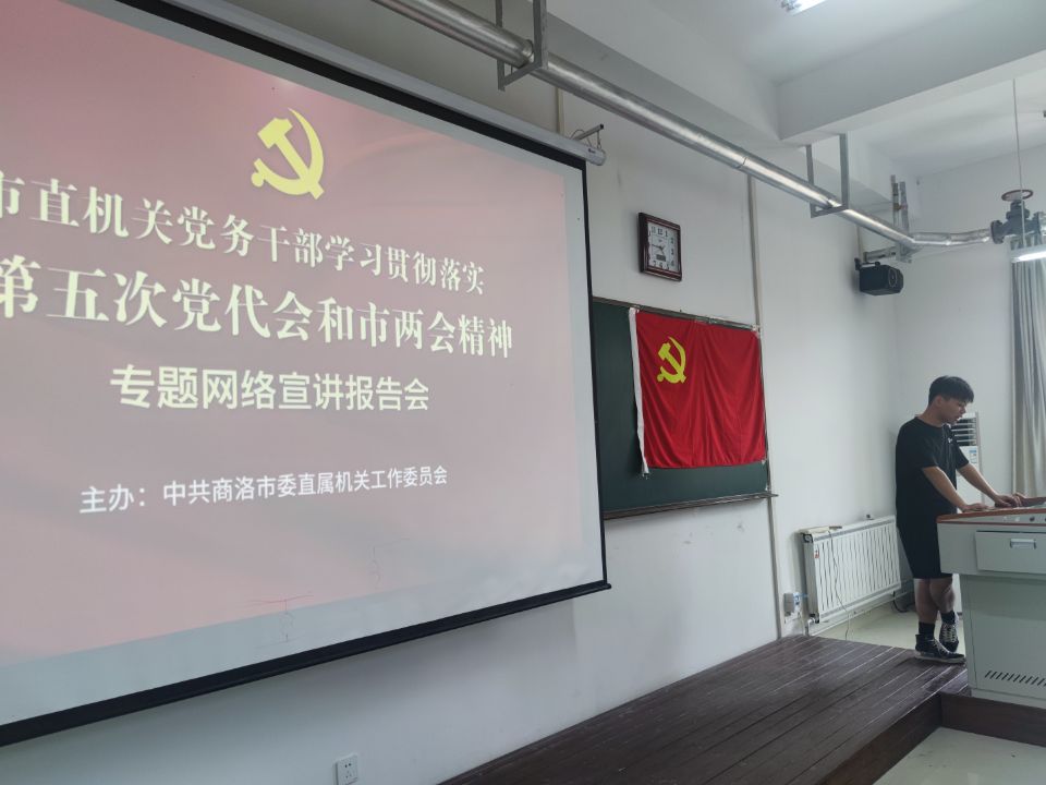 本次活动,以张昱哲带领学习为主,报告会由市委机关工委在商洛新闻网、商洛发布手机端平台举办市直机关党务干部学习贯彻落实市第五次党代会和市两会精神专题网络宣讲报告会,邀请市委党校副教授殷莉、陈永芝作专题讲座。会上由中共商洛市委党校经济学教研室副主任、副教授陈永芝主讲全力打造“一都四区” 矢志实现追赶超越 ——学习贯彻商洛市第五次党代会及全市两会精神 ;市委理论宣讲团成员、中共商洛市委党校副教授殷莉主讲了以“三新”战略为指引 谱写商洛高质量发展新篇章——学习贯彻市第五次党代会精神汇报。讲座紧紧围绕习近平总书记来陕考察重要讲话重要指示精神、乡村振兴、营商环境等内容,从市第五次党代会及市两会概况、深刻认识“一都四区”的科学内涵及重大意义、以“三新”战略为指引,奋力谱写商洛高质量发展新篇章等方面进行了全面系统地阐释和解读。