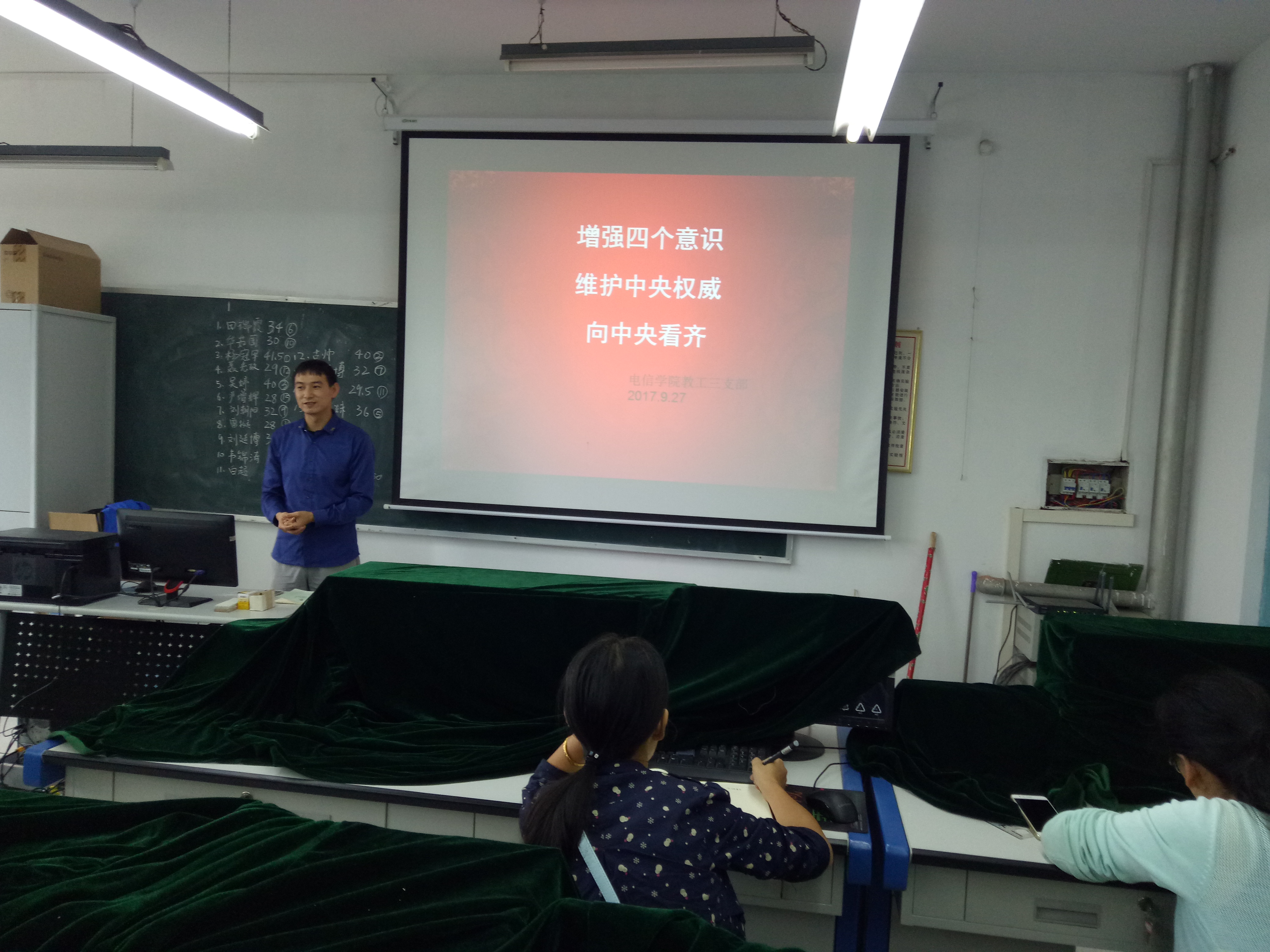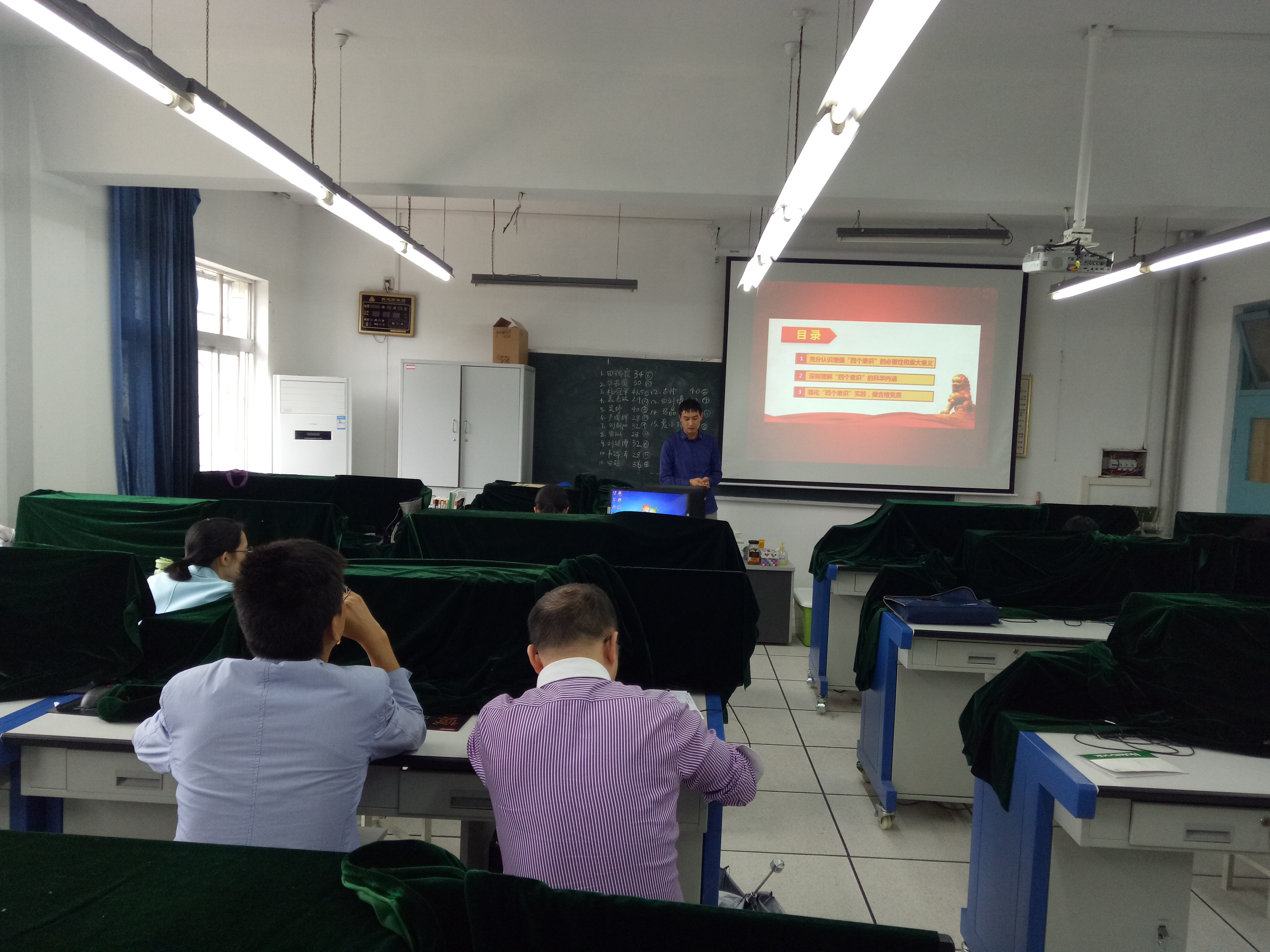 王博同志充分运用多媒体教学手段,图文并茂的为大家讲解了增强“四个意识”的必要性重要性及深刻内涵,进一步就如何强化“四个意识”实践、做合格党员做了深刻的解读和分析。王博在讲课中指出,党员要牢记政治意识、大局意识、核心意识和看齐意识,始终以党中央习近平总书记为核心,向党中央看齐,始终保持大局意识,把锤炼党性修养作为党员终身的必修课。