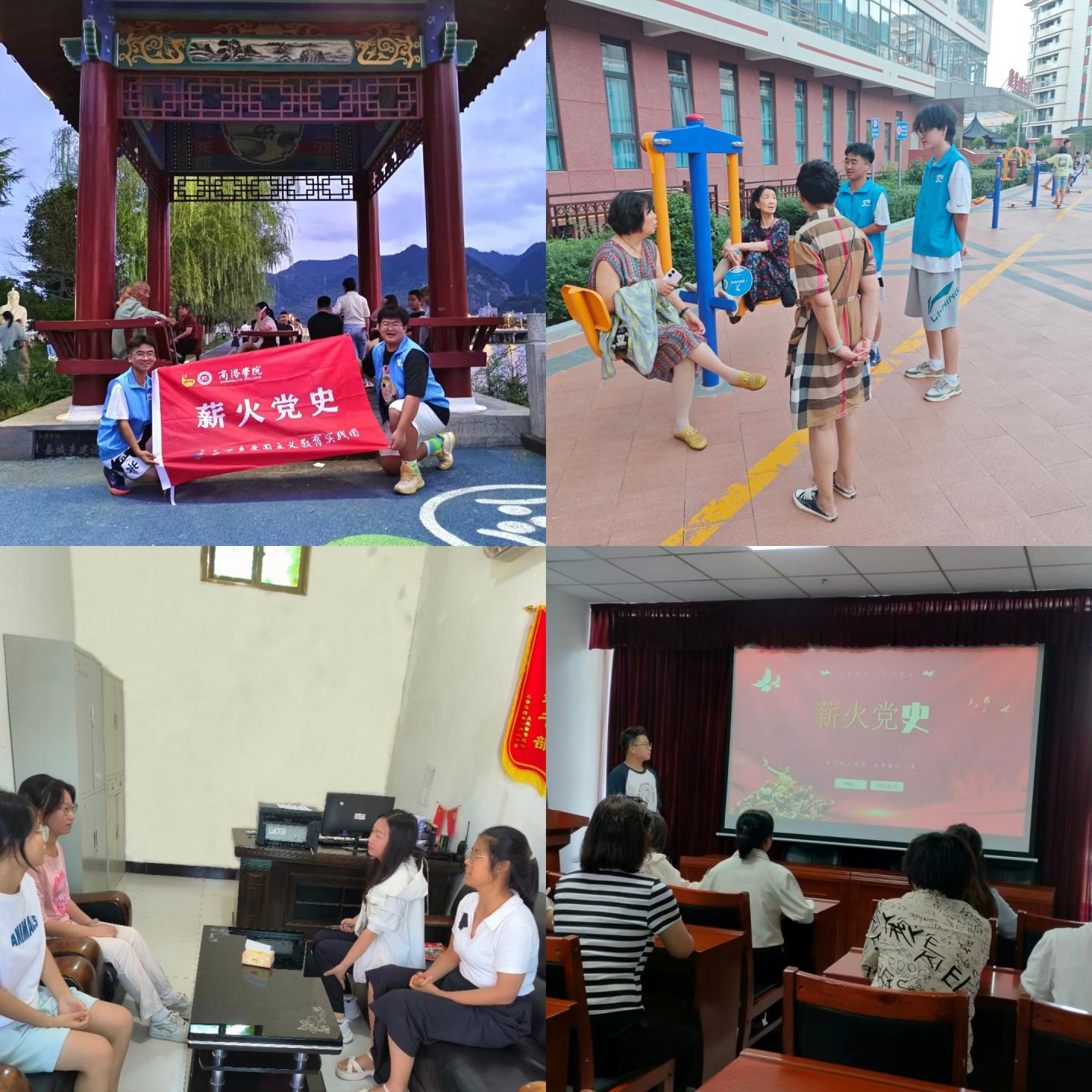 实践归来走进社区,结合所学服务群众。在中街社区,团队成员结合暑期实践所学,向社区居民宣讲了红色故事。在金山康养院,团队成员和社区居民进行爱国主义知识互动调研、了解居民的爱国爱党现状。在西关社区广场,团队成员与当地“夕阳红”合唱团一起合唱了《东方红》、《团结就是力量》、《游击队之歌》等红色歌曲。活动现场气氛热烈,在普及爱国知识的同时,团队成员也提醒广大居民雨季汛期注意防范山体滑坡、泥石流等自然灾害,关心社区居民生活日常,赢得了广大居民的认可和赞扬。